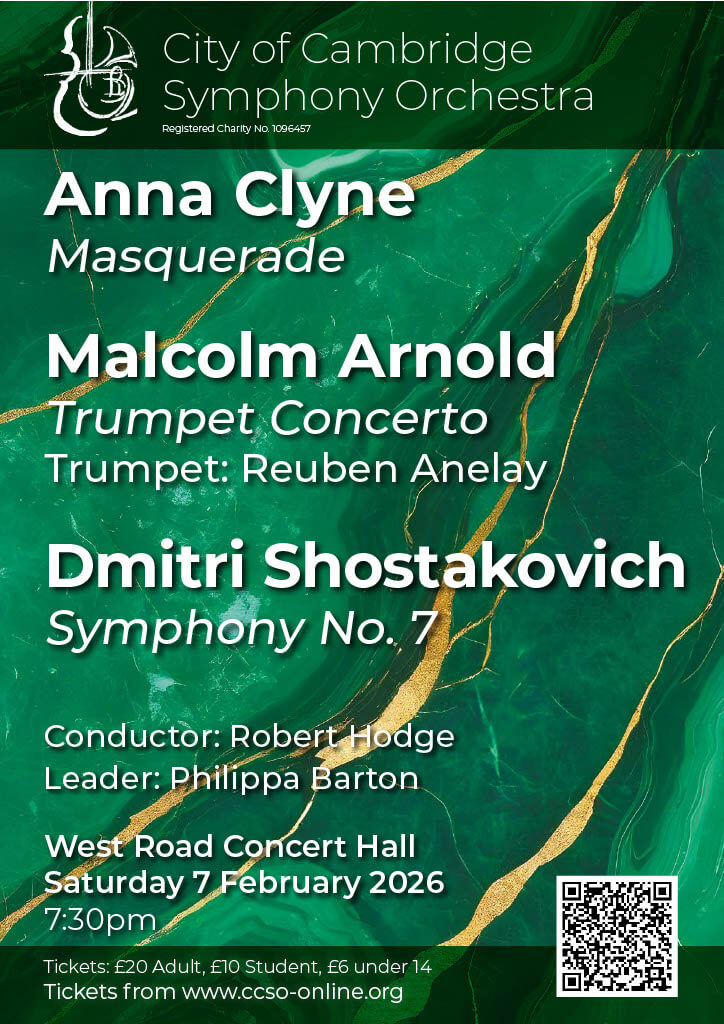 We are excited to welcome the talented young trumpeter Reuben Anelay to perform Malcolm Arnold’s trumpet concerto with us. Arnold began his professional life as principal trumpet in the Philharmonia orchestra, so it is no surprise that this compact concerto shows off the instrument brilliantly, from fanfares to wistful melodies to virtuoso fireworks, all in the space of 12 minutes.